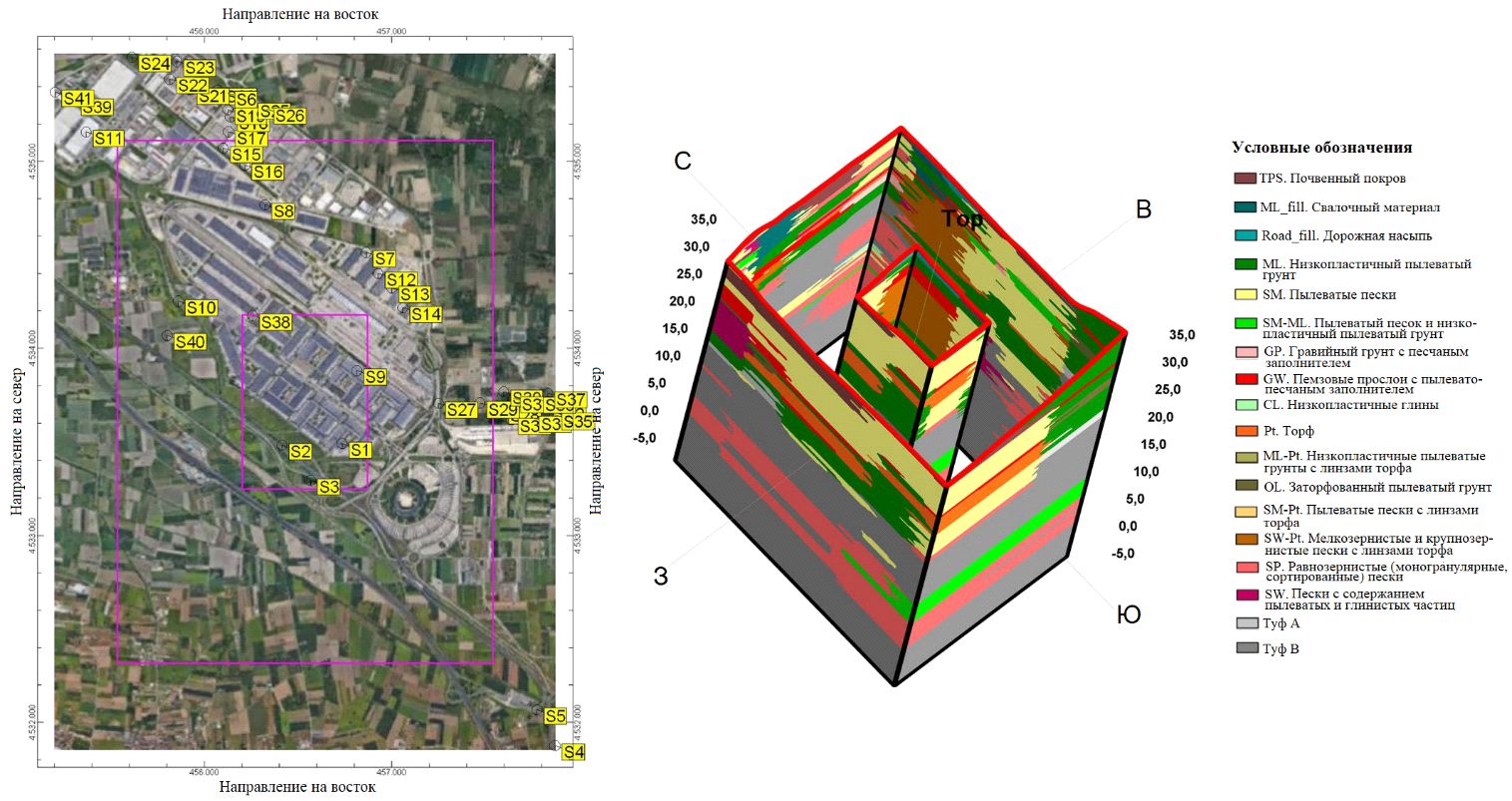 В представленной работе рассматривается случай исследования весьма гетерогенной и гетеропической пирокластическо-аллювиальной стратиграфической обстановки равнины Нола (административная область Кампания, Южная Италия), характерной для площадки планируемого строительства логистического комплекса коммуны Нола. Использованные подходы основывались на анализе большого массива стратиграфических, лабораторных и полевых геотехнических данных, собранных для проектирования указанного объекта, с помощью инженерно-геологического моделирования в специализированном программном комплексе с расширенными возможностями для пространственного моделирования геологической и геотехнической информации, а также ее визуализации.