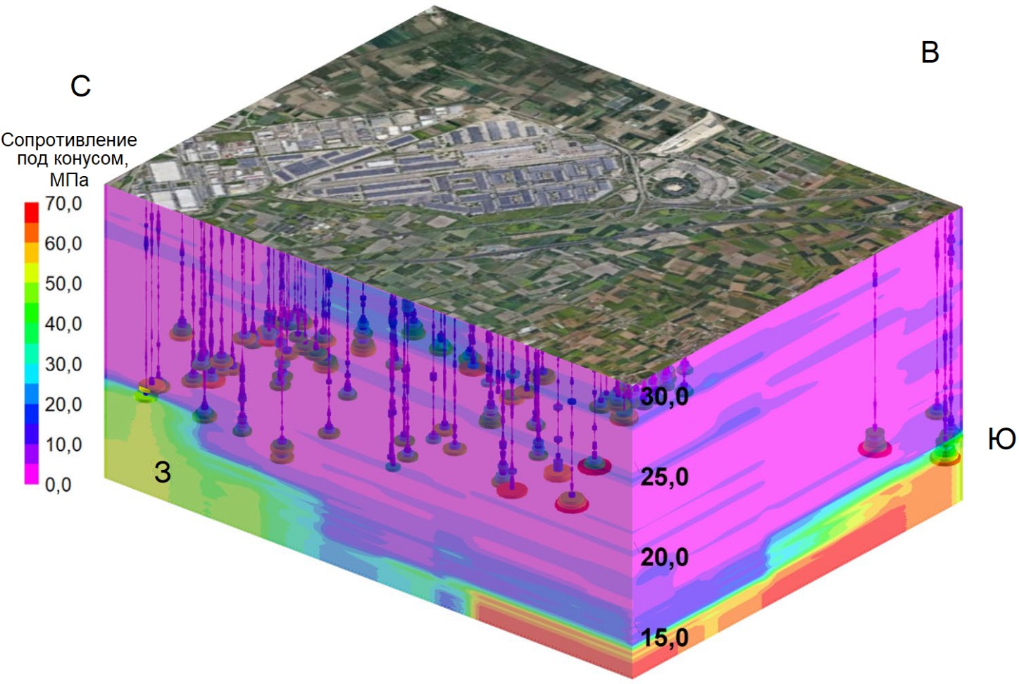 Рис. 8. 3D модель сопротивления под конусом зонда по результатам испытаний методом CPT