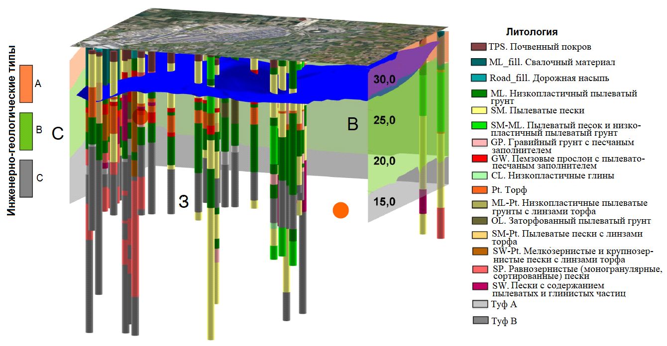 На основе стратиграфических и геотехнических данных была реконструирована геологическая модель изучаемой территории (рис. 4). Наборы этих данных включают результаты:
