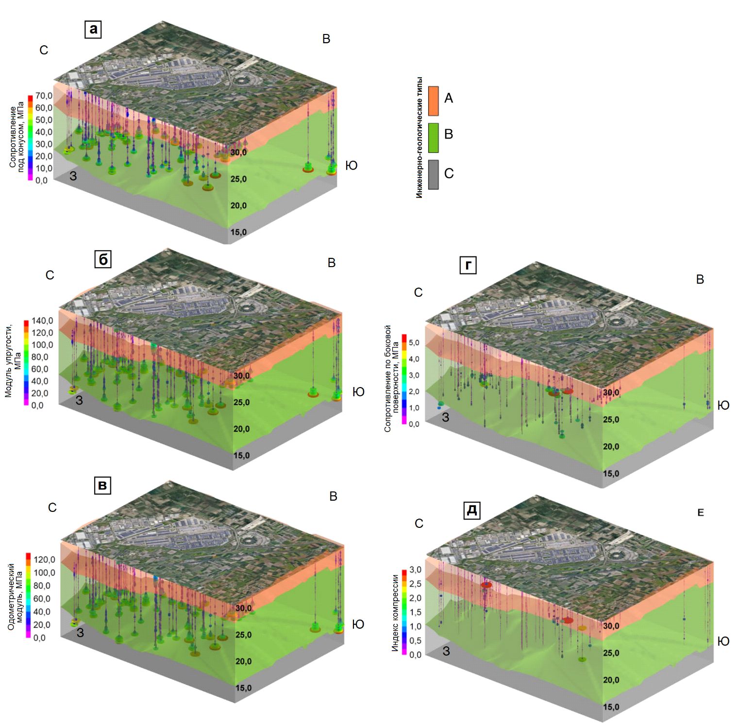 Рис. 11. Инженерно-геологическая модель, объединенная со следующими геотехническими моделями: а – сопротивления под конусом зонда; б – модуля упругости; в – одометрического модуля деформации; г – сопротивления по боковой поверхности зонда, д – индекса компрессии (в действительности здесь нет никакого объединения – авторы не понимают, что по своей сути инженерно-геологическая модель содержит на самом низком уровне решение пространственной задачи по распределению свойств либо через константную/постоянную функцию, либо через геостатистическую функцию, но с предварительно разбитым на объемы пространством (с использованием кригинга или кокригинга). – Ред.)