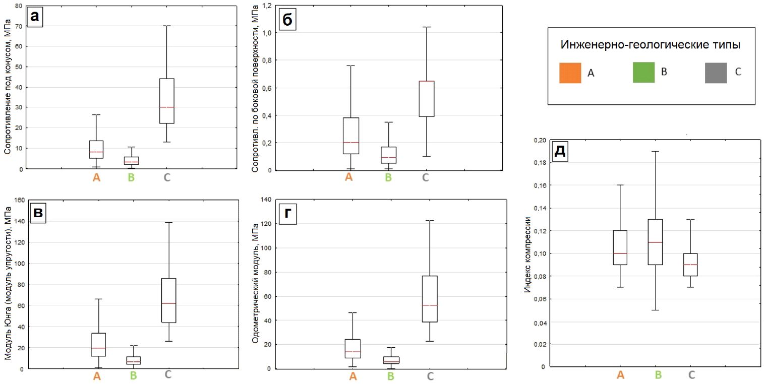 Инженерно-геологические единицы/типы (units/types) были геотехнически охарактеризованы с помощью статистического анализа основных свойств, который проводился с использованием диаграмм размаха типа «ящиков с усами» (box plots). Для каждой инженерно-геологической единицы была рассчитана диаграмма размаха для каждого показателя геотехнических свойств, а затем было проведено их попарное сравнение (рис. 12, а–д), что выявило согласованность с тем, что было описано ранее по поводу их значений. То есть тип C – это единственная инженерно-геологическая единица с более высокими показателями геотехнических свойств, так как сопротивление под конусом, сопротивление по боковой поверхности, модуль упругости и одометрический модуль достигают там самых больших значений, а индекс компрессии – наименьших. Напротив, тип B характеризуется самыми плохими геотехническими свойствами, поскольку первые четыре параметра из вышеупомянутых имеют тенденцию к распределению в сторону самых низких значений, а индекс компрессии – в сторону самых больших в соответствии с более высокой сжимаемостью этих грунтов.