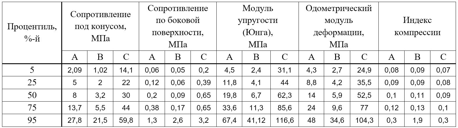 Таблица. Значения процентилей геотехнических характеристик, рассчитанные для трех инженерно-геологических единиц/типов А, В, С
