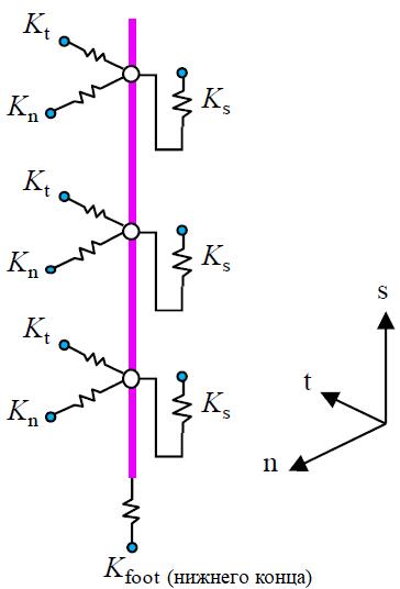 Рис. 2. Жесткость погруженных интерфейсных элементов на боковой поверхности и под нижним концом сваи