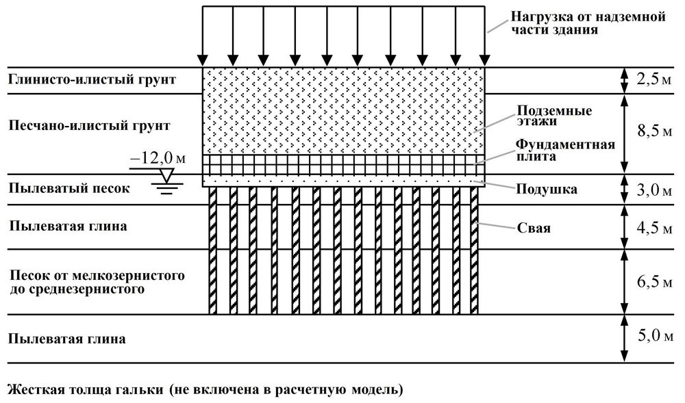 Были взяты данные инженерных изысканий на площадке строительства в Пекине (Китай). Порядок расположения слоев грунта сверху вниз там был следующим: