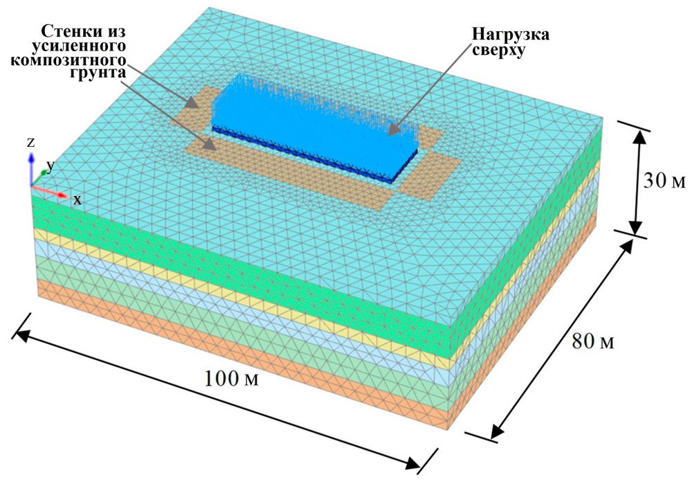 Размер модели. В соответствии с размером свайно-плитного фундамента и глубиной выемки грунта при строительстве котлована под подземную часть здания длина и ширина модели были определены в два раза больше глубины выемки путем нескольких изменений размеров и перестраиваний модели. По высоте модель заключалась между поверхностью земли и кровлей твердой толщи гальки. Ее окончательные длина, ширина и высота составили 100; 80 и 30 м соответственно.