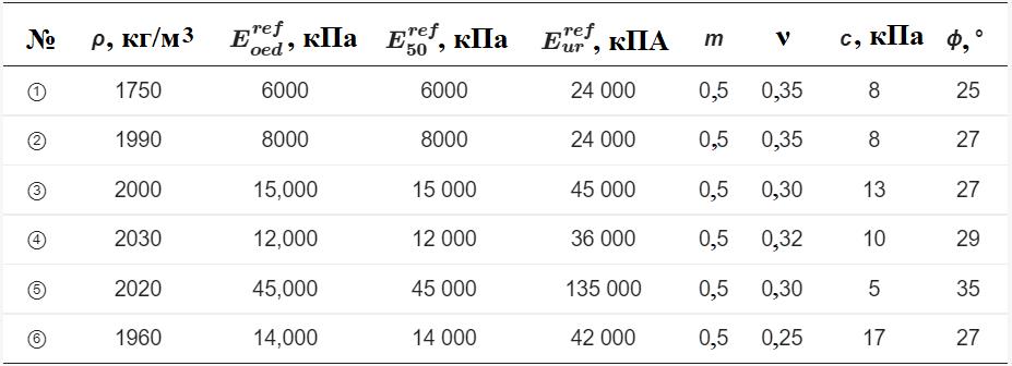 Эти параметры были определены с помощью метода, предусмотренного в PLAXIS. Величины Eoedref и ν были оценены эмпирически, в то время как в PLAXIS по умолчанию установлено, что E50ref = Eoedref, Eurref = E50ref и m = 0,5. Другие параметры были получены с помощью основных геотехнических, трехосных и компрессионных испытаний (consolidation tests) [33].