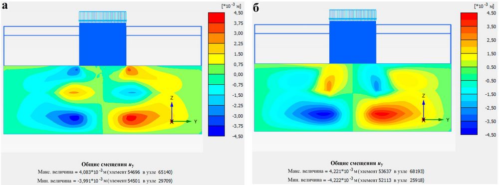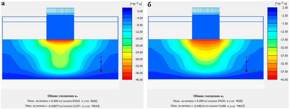 Рис. 7. Сравнение вертикальных деформаций подушки между подошвой фундаментной плиты и сваями: а – для модели с использованием погруженных свай; б – для модели эквивалентной армированной зоны