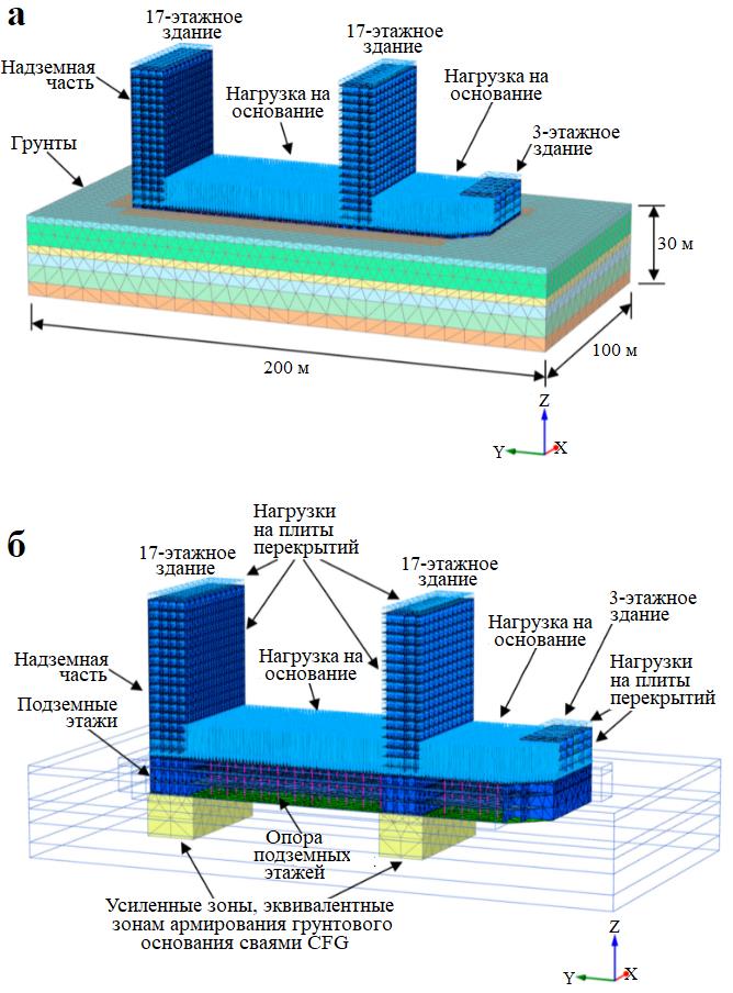 Рис. 15. Интегральная сетка 3D-модели комплекса зданий и его основания (а); сетка 3D-модели надземной части, подземной части и усиленных зон основания фундаментной плиты под многоэтажными зданиями комплекса (б)