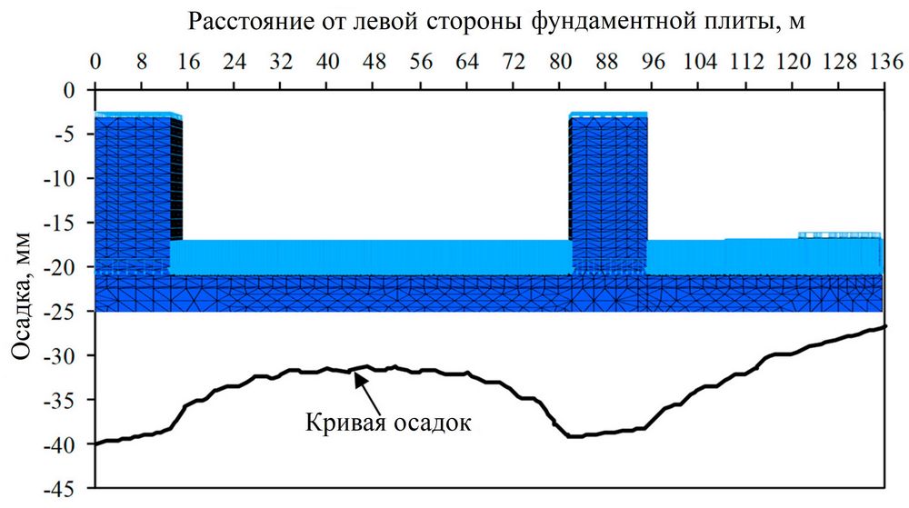 Рис. 17. Распределение осадок вдоль фундаментной плиты комплекса зданий (вертикальный разрез модели, проходящий посередине многоэтажных домов и плиты, и кривая осадок)