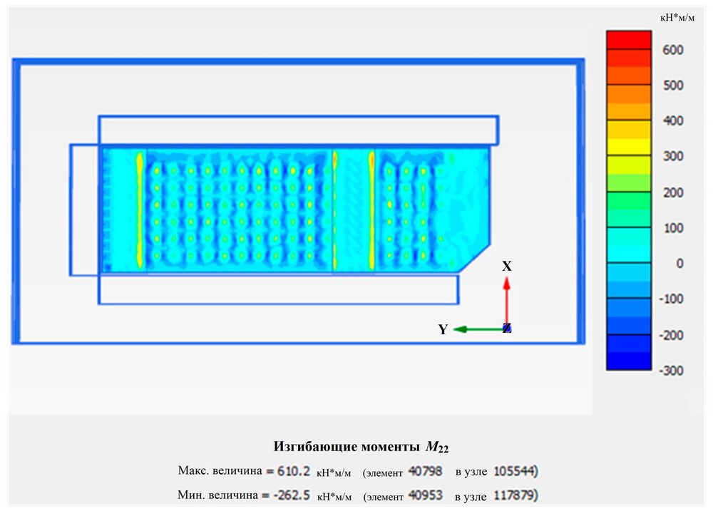 Рис. 18. Распределение изгибающих моментов по фундаментной плите комплекса зданий (горизонтальный разрез через плиту)