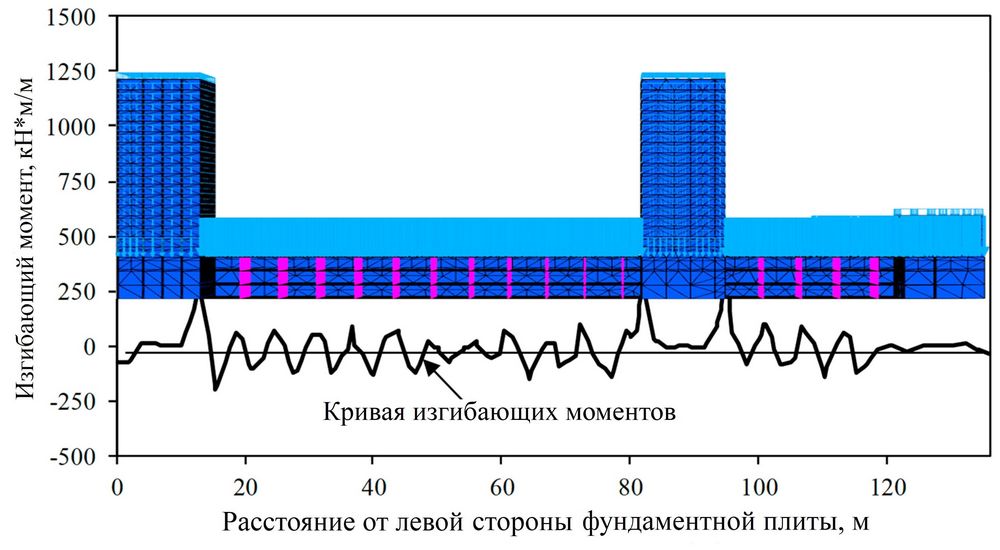 Рис. 19. Распределение изгибающих моментов в фундаментной плите комплекса зданий (вертикальный разрез, проходящий посередине многоэтажных домов и плиты, и кривая изгибающих моментов).