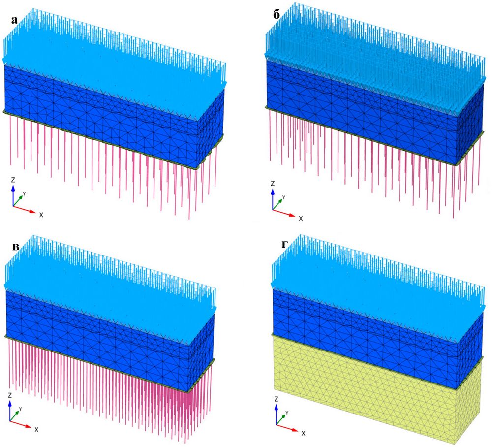 Рис. 9. Модели свайно-плитного фундамента для схем моделирования 1 (а), 2 (б), 3 (в) и 4 (г). Схемы моделирования 1–4 описаны в тексте ранее.