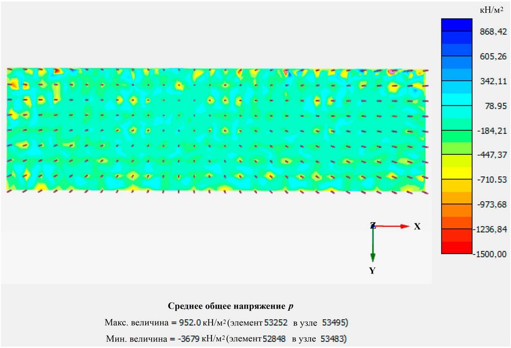 Чтобы повысить точность расчетов на основе схемы 2, было проведено специальное моделирование для грунтовой подушки путем уточнения сетки конечных элементов этого слоя таким образом, чтобы можно было должным образом отразить концентрацию напряжений на верхнем конце сваи. Можно увидеть, что общее среднее напряжение p грунтовой подушки было распределено равномерно (рис. 10), что позволило эффективно избежать чрезмерной концентрации локальных напряжений на верхнем конце сваи, обеспечив точность расчетов.