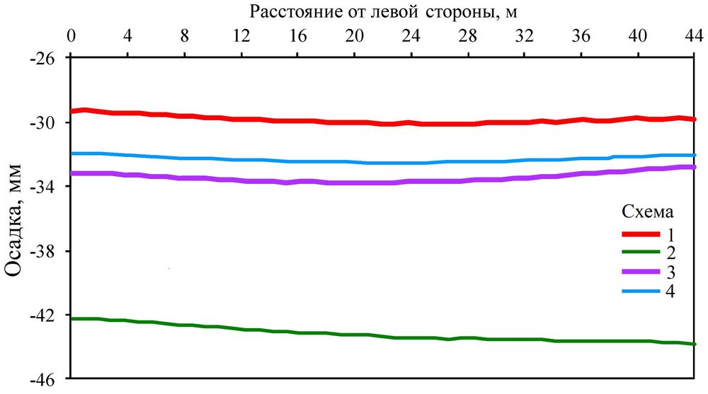 На рисунке 11 сопоставлены графики осадок фундаментной плиты вдоль ее продольного сечения, проходящего через ее середину, на основе четырех вышеописанных схем моделирования. Наибольшей по модулю была максимальная осадка для схемы 2 (Smax2 = -43,8 мм), наименьшей – для схемы 1 (Smax1 = -30,43 мм), а для схем 3 и 4 она была немного больше, чем для схемы 1. Из распределений осадок, показанных на рисунке 8, очевидно, что осадка Smax2 для схемы 2 произошла на правом конце плиты, а кривые осадок для трех других схем были распределены приблизительно симметрично (то есть максимальная осадка произошла около центра плиты). При этом распределения осадок плиты для четырех схем были достаточно равномерными. Различия между максимальными и минимальными осадками плиты для каждой схемы не превышали 2 мм (см. рис. 11).