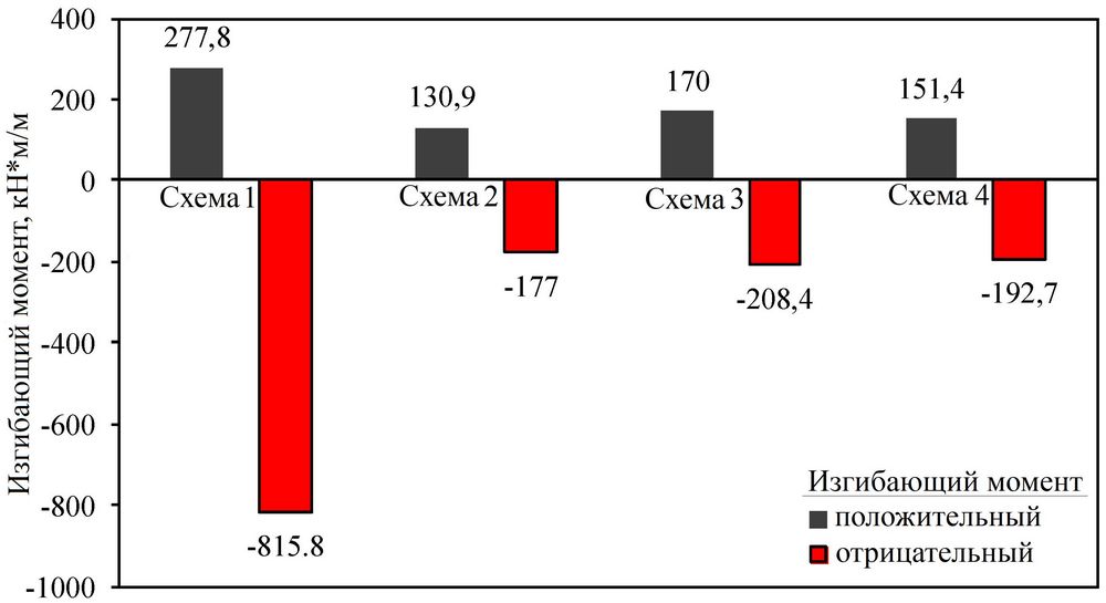 По схеме 1 бетонные буронабивные сваи жестко соединялись с плитой и осадки последней были наименьшими. Однако соединение между верхним концом сваи и плитой создавало относительно большой изгибающий момент. На рисунке 12 сопоставлены гистограммы экстремумов изгибающих моментов плиты для четырех расчетных схем. Отрицательный изгибающий момент для схемы 1 составил Mmin1 = -815,8 кН*м/м, и этот экстремум был значительно больше по модулю, чем для трех других схем.