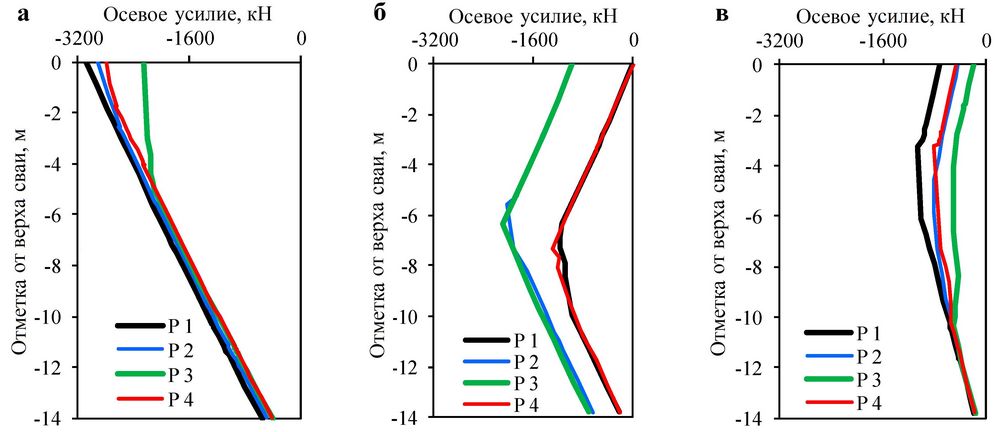 Рис. 13. Распределение осевых усилий в сваях для схем моделирования 1 (а), 2 (б) и 3 (в), описанных в тексте ранее. Расположение свай P1–P4 показано на рисунке 4
