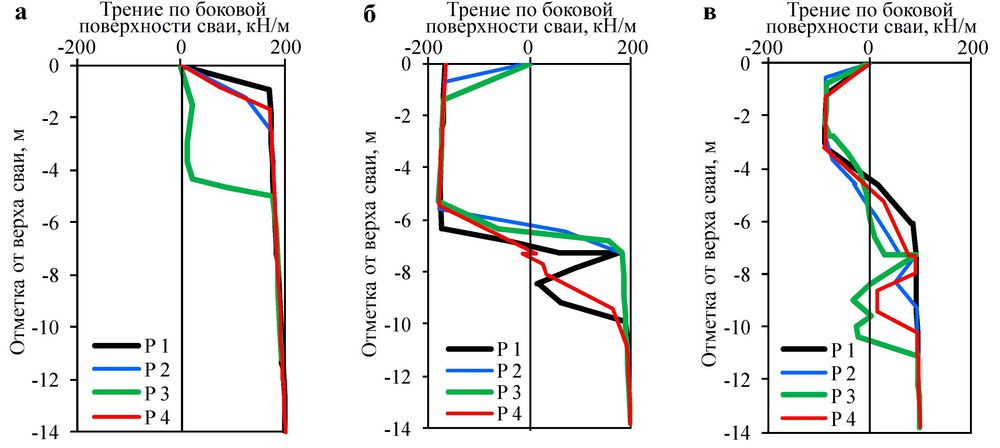 Рис. 14. Распределение трения по боковой поверхности свай для схем моделирования 1 (а), 2 (б) и 3 (в), описанных в тексте ранее. Расположение свай P1–P4 показано на рисунке 4