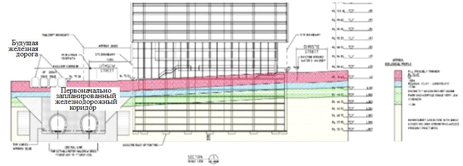 Рис. 3. Схематичный поперечный разрез нижней части проектируемого комплекса зданий с первоначально предлагавшейся железнодорожной линией в 14 м от западного края пятна застройки
