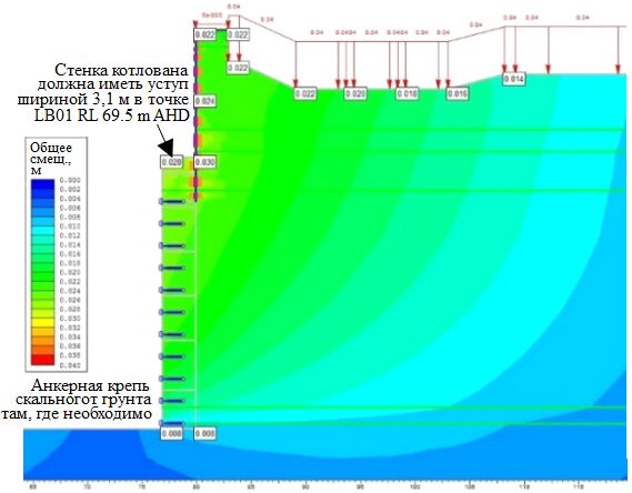 Рис. 10. Модель котлована в программе RS3 с прогнозируемыми воздействиями на железнодорожную линию в случае оставления выступа скальных грунтов у подпорной стенки, идущей вдоль железной дороги (этот выступ должен быть вынут последним), а также при добавлении угловой системы распорок и дополнительных анкерных креплений
