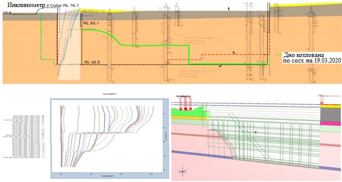 Рис. 6. Ход выемки грунта на разрезе с запада на восток (сверху) и трехмерная модель части котлована и окружающего грунта вдоль этого разреза в программе RS3 (внизу справа), откалиброванная с помощью результатов измерений инклинометром с 14 ноября 2019 г. по 19 марта 2020 г. (внизу слева)