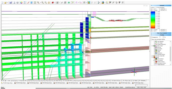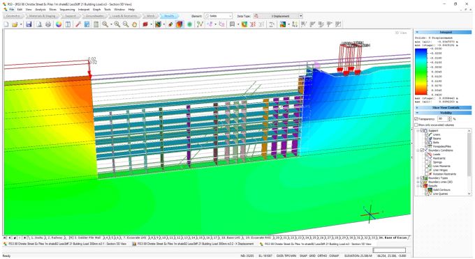 Первоначальная численная оценка реакций грунта и установленной системы крепления котлована была выполнена с использованием двумерного конечноэлементного анализа в программе Rocscience RS2 (рис. 5) и анализа методом конечных разностей в программе FLAC 3D, разработанной американской компанией Itasca Consulting Group. Однако для более детальной и реалистичной оценки того, как строительство повлияло на существующую инфраструктуру, было проведено трехмерное численное моделирование на основе метода конечных элементов в программе Rocscience RS3.