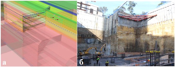 Рис. 9. Модель котлована в программе RS3 (а) и его фотография (б) с системой крепления из свай и анкеров и с угловой системой распорок