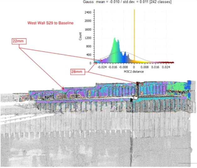 Рис. 11. Результаты лазерного сканирования западной подпорной стенки, которое показало среднее смещение 10 мм и максимальное смещение 28 мм