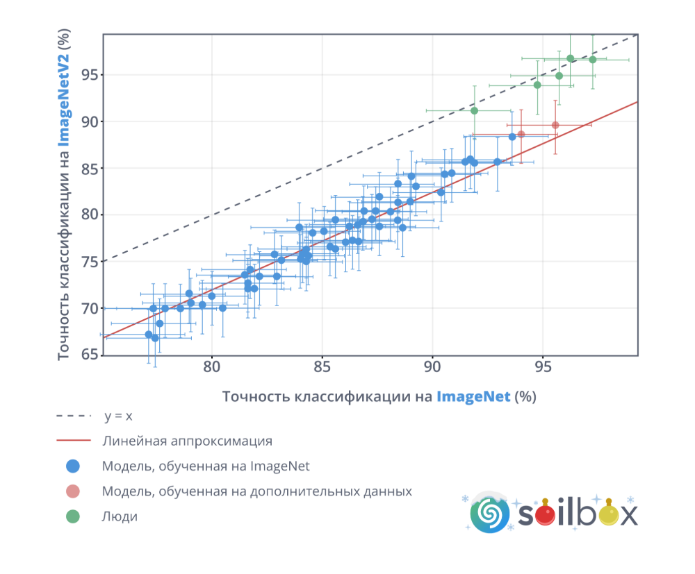 Рис. 1. Сравнение точности распознавания изображений на наборах данных ImageNet и ImageNetV2 между алгоритмами машинного обучения и человеком [Shankar и др., 2020, с изменениями]. Указана многоклассовая точность как для свёрточных нейронных сетей (CNN), так и для живых участников на проверочном наборе данных ImageNet в сравнении с их точностью на тестовом наборе ImageNetV2. Показаны 95% доверительные интервалы Клоппера-Пирсона