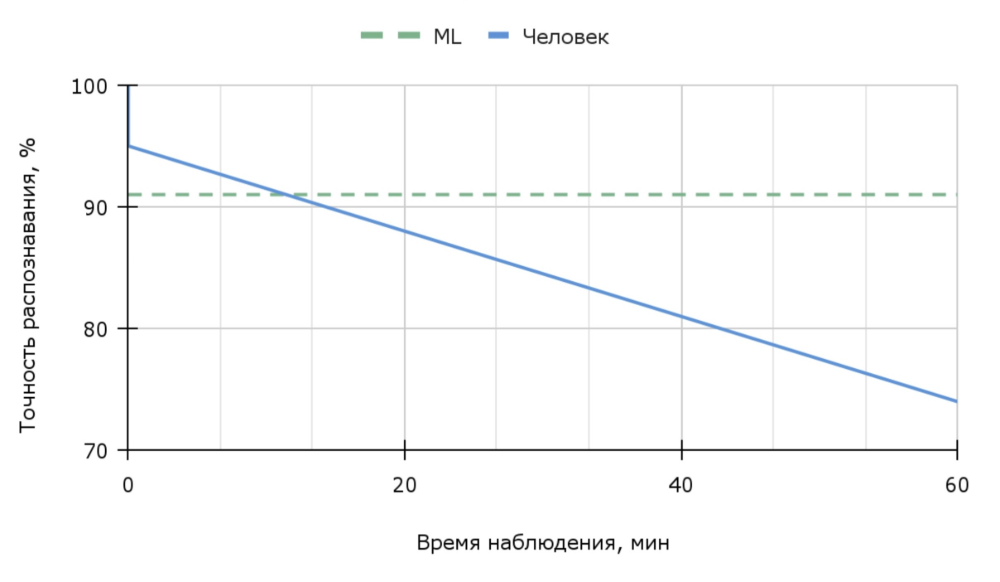 Рис. 2. Падение точности распознавания объектов у человека примерно с ~95% до ~75% за ~60 минут, где ML – алгоритмы машинного обучения