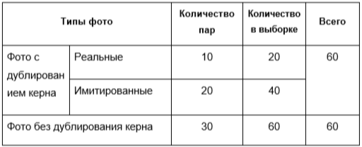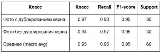 Всего для тестирования алгоритма использовалось 120 фотографий керна, из которых 60 изображений соответствовало случаям дублирования керна, а 60 – отсутствию дублей; 40 изображений было получено в результате умышленной перекладки керна для целей тестирования; 20 отобрано из реальных примеров фальсификации данных. Таким образом, тестовая выборка была полностью сбалансирована, что исключало систематическое смещение при оценке качества работы алгоритма.