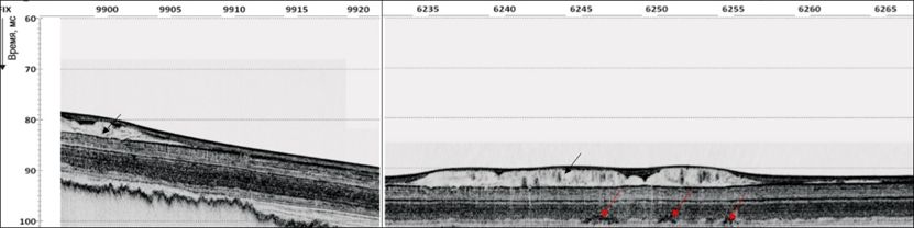 Рис. 4. Акустически прозрачное тело (стрелки вверху) на траверзе м. Бол. Утриш (слева – продольный (фрагмент), справа – поперечный профиль). Стрелки внизу – газонасыщенные отложения