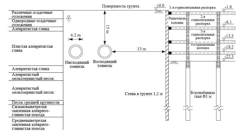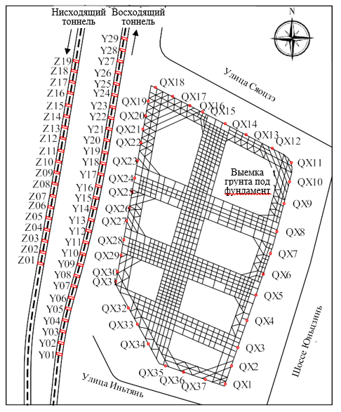 Быстрое развитие метро в последние годы стало важным шагом к снижению транспортных заторов в густонаселенных городах [20,22]. В то же время, чтобы облегчить перемещение и повысить эффективность использования подземных пространств, строится все больше и больше высотных зданий, а их фундаменты располагаются в непосредственной близости от существующих линий метрополитена. Земляные работы для устройства таких фундаментов неизбежно изменяют первоначальные поля напряжений и смещение грунта основания и таким образом влияют на существующие конструкции тоннелей метрополитена [3]. Если деформация или смещения, вызванные земляными работами, превышают допустимые пределы конструкции тоннеля, то тоннель может быть серьезно поврежден [38].