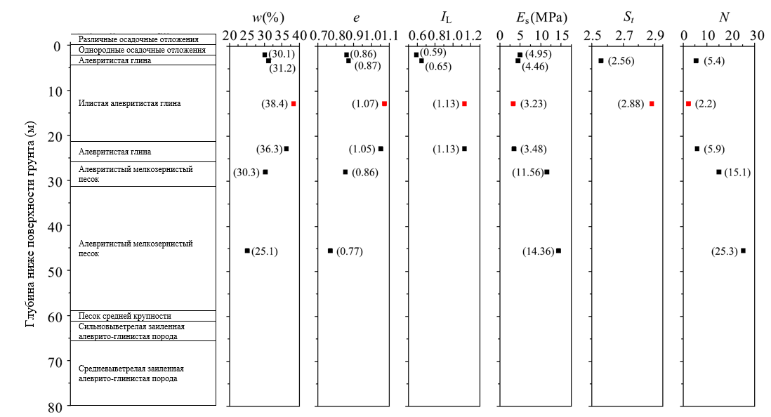 Примечание: w = водосодержание, e — коэффициент пористости, IL = индекс текучести, Es = компрессионный модуль, st= чувствительность, N = количество ударов по стандартному испытанию грунта на пенетрацию (SPT).