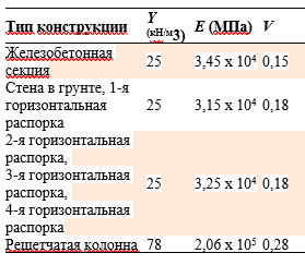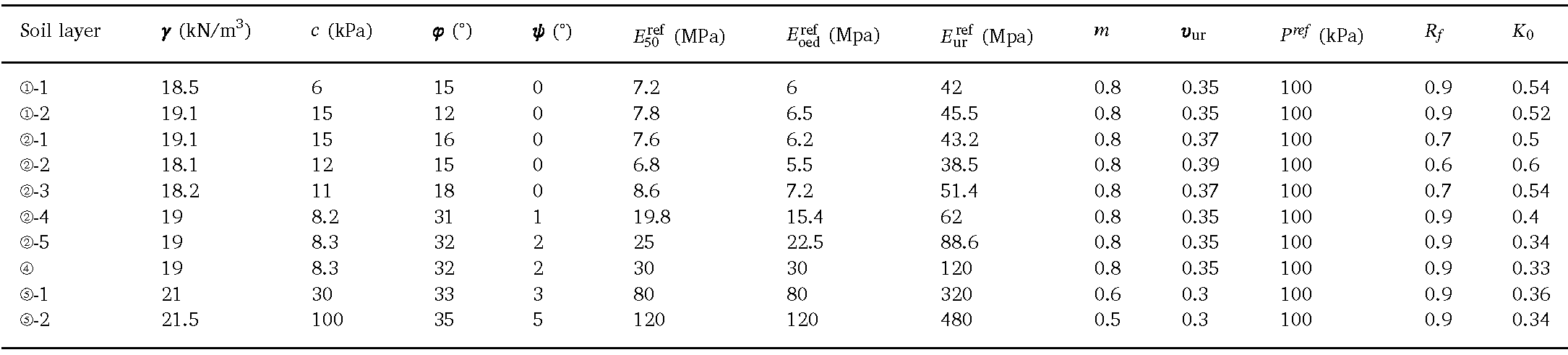 В таблицах 1 и 3 представлены исходные параметры материалов грунтов и подпорных сооружений выемок под фундамент соответственно. Для слоев грунта использовалась модель упрочняющегося грунта (Hardening Soil) [30], а линейно-упругая модель использовалась для материала подпорных сооружений. Некоторые исследования [8, 41] показали, что модель упрочняющегося грунта может учитывать характеристики упрочнения, указывать на разницу между нагружением и разгрузкой, а определенная жесткость грунта зависит от изменения напряжений во времени и пути нагружения. Используя эти данные, результатами моделирования можно одновременно представить обоснованные параметры деформации стены в грунте и деформации грунта за стеной, что подходит для численного моделирования глубоких выемок в неустойчивой среде. Параметры модели упрочняющегося грунта в основном были получены из данных полевых и лабораторных испытаний, а параметры подпорных сооружений выемок грунта под фундамент были получены в основном из проектных чертежей. Следует отметить, что принятые здесь параметры являются лишь предварительными, а действительные исходные параметры необходимо определить после корректировки в соответствии с результатами натурного мониторинга.