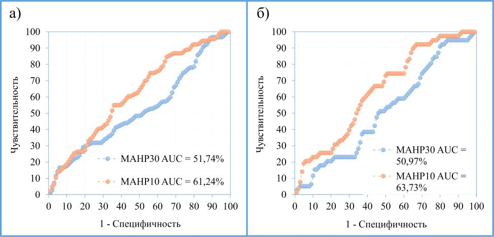 Рис. 7. Кривая успеха (a) и прогнозирования (b) моделей MAHP30 и MAHP10 по кривой ROC
