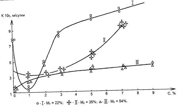Изменение агрегатного состояния глинистого грунта влияет на его фильтрационную способность. Общий характер изменения коэффициентов фильтрации (Кф) в зависимости от засоления при учете только степени агрегированности грунта, которое приводит к преобразованию геометрии одного порового пространства, показан на рисунке 1 (Дашко, 2015). В более легких глинистых разностях при засолении порядка 1% наблюдается снижение коэффициентов фильтрации за счет диспергации породы (минимум на кривой 1, см. рис. 1). Дальнейшее засоление приводит к увеличению коэффициента фильтрации. Рост содержания глинистой фракции (Мс) вызывает менее заметное влияние диспергации на изменение коэффициента фильтрации (кривая 2 на рисунке 1). При высоком содержании глинистых частиц (Мс более 50%) идет постепенное возрастание коэффициента фильтрации породы по мере ее засоления причем гораздо менее интенсивное, чем для легких разностей (кривая 3 на рисунке 2). Эти явления объясняются тем, что агрегация в высокодисперсных грунтах незначительно влияет на увеличение размера пор, поскольку укрупнение начинается с самых тонких коллоидных фракций и постепенно распространяется на более крупные.