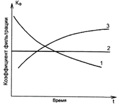 Для учета этого фактора важно знать «порог осмотической усадки» (Споу) изучаемого грунта (по Р.Э.Дашко, 2015) – концентрацию порового раствора грунта, при которой концентрационной усадки не происходит. Если концентрация внешнего фильтрующего (Сф) раствора больше порога осмотической усадки (Споу), то происходит снижение степени раскрытия микротрещин, и постепенно коэффициент фильтрации со временем уменьшается (рис 2. кривая 1). При Сф = Споу наблюдается низменность либо постепенно закрытие трещин в процессе набухания блоков глинистых пород (рис 2. кривая 2). Если же Сф Споу, то происходит увеличение степени раскрытия микротрещин и осмотический подток раствора внутрь образца, что приводит к набуханию грунта и увеличению коэффициента фильтрации (рис. 2. кривая 3).