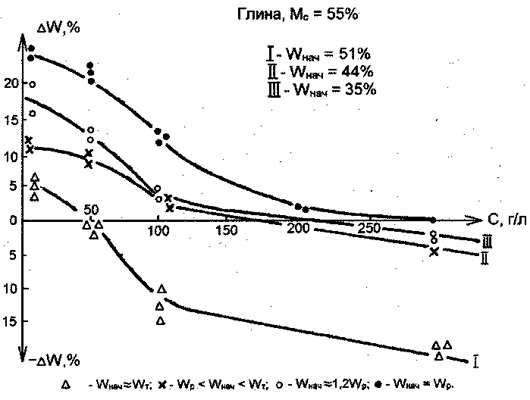 Рис. 4. Изменение влажности (ΔW) глинистых грунтов за счет осмоса при взаимодействии их с растворами разной концентрации (С) (по Р.Э.Дашко, 2015)