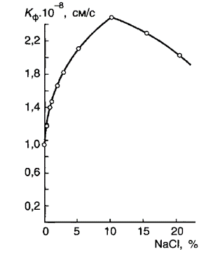 В целом зависимость коэффициента фильтрации высокодисперсных глин от концентрации электролита порового пространства в широком диапазоне концентрации носит сложный характер (рис. 5). В области малых концентраций (менее 10% NaCl) их рост приводит к увеличению Кф за счет агрегации частиц и увеличения размера межагрегатных пор. Однако дальнейший рост концентрации проводит к снижению Кф вследствие того, что при высоких концентрациях порового раствора начинает сказываться влияние его повышенной вязкости, рост которой и ведет к снижению Кф, что и наблюдается в экспериментах (Грунтоведение, 2005).