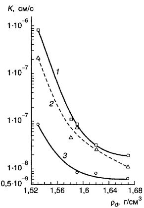 Рис. 6. Зависимость коэффициента фильтрации раствора соли (1,2) и воды (3) от плотности скелета суглинка (по Павилонскому, 1977): 1 – максимальные значения, 2 – минимальные значения при длительной фильтрации