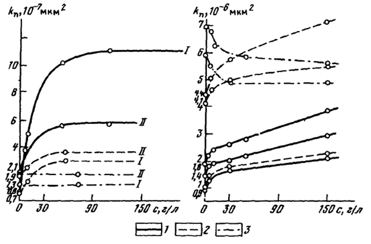 С увеличением минерализации растворов NaCl и CaCI2 коэффициент проницаемости (kп) глин возрастает (рис. 8). Основной прирост значений kп наблюдается в области концентраций до 10—30 г/л. Так, при переходе от дистиллированной воды к хлоридным растворам концентрации 10 г/л проницаемость в зависимости от типа глины и раствора возрастает в 1,5—6,3 раза, а с увеличением концентрации от 10 до 55—60 г/л — в 1,3—2,3 раза. При увеличении же концентрации раствора от 55—60 до 100—115 г/л коэффициент проницаемости практически не меняется.