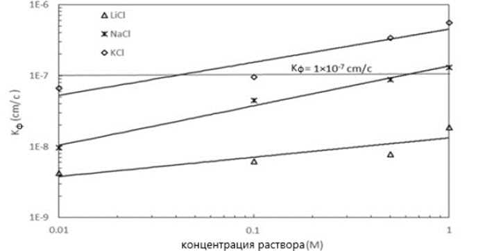 К.Ксу и др. (Xue et al., 2012) изучали влияние растворов солей высокой концентрации (MgCl2, CaCl2, NaCl и KCl) на коэффициент фильтрации бентонитов и подтвердили, что коэффициент фильтрации увеличивается в несколько раз при фильтрации растворов более высокой концентрации по сравнению с проницаемостью грунтов с дистиллированной водой. Ими подтверждено, что коэффициент фильтрации монтмориллонитовых глин в зависимости от состава солей порового раствора увеличивается в ряду: