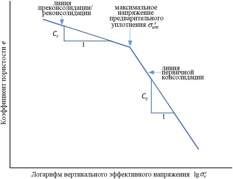 Осадка слоя глины может быть традиционно оценена на основе консолидационных испытаний образцов в приборах компрессионного сжатия (в условиях одномерной консолидации). На рисунке 1 показана идеализированная полулогарифмическая компрессионная кривая – скорректированный график изменений коэффициента пористости (вертикальная ось) в зависимости от вертикального эффективного напряжения (горизонтальная ось, логарифмический масштаб).