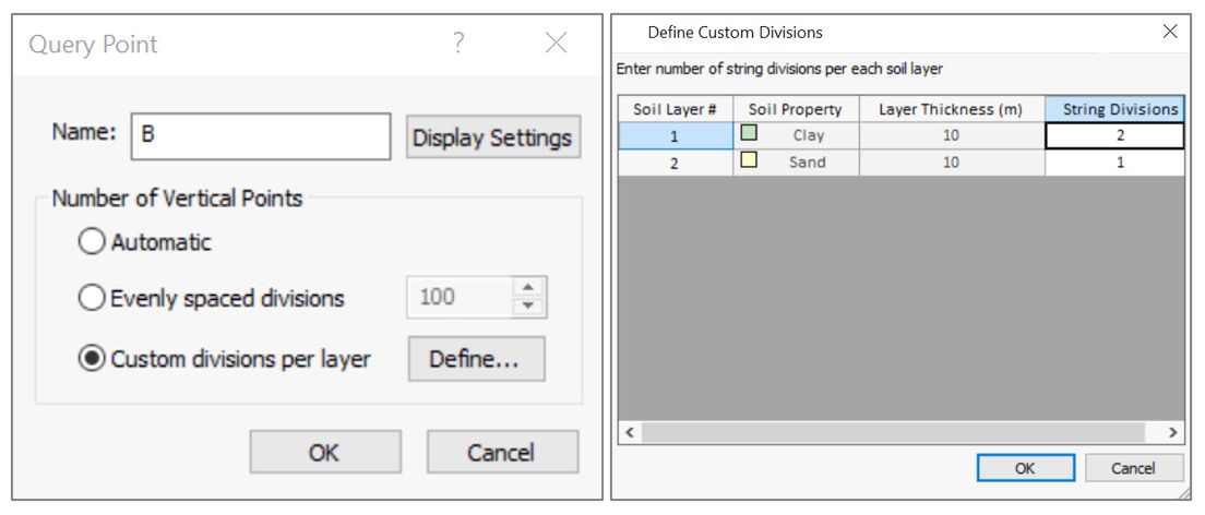 Программа Settle3 вычисляет осадки для выбранных пользователем условий расчета с помощью так называемых точек (пунктов, строк) запроса. В данном случае условие в точке запроса – это выбранное пользователем количество подслоев в каждом слое (рис. 3). Соответствующее диалоговое окно включает обозначение точки запроса, параметры вывода результатов запроса на экран и метод, используемый для вертикального расчленения слоев. Параметры расчленения по умолчанию устанавливаются автоматически, но пользователь может изменить это – например так, чтобы подслои были одинаковой толщины или чтобы каждый слой разделялся на определенное количество подслоев.