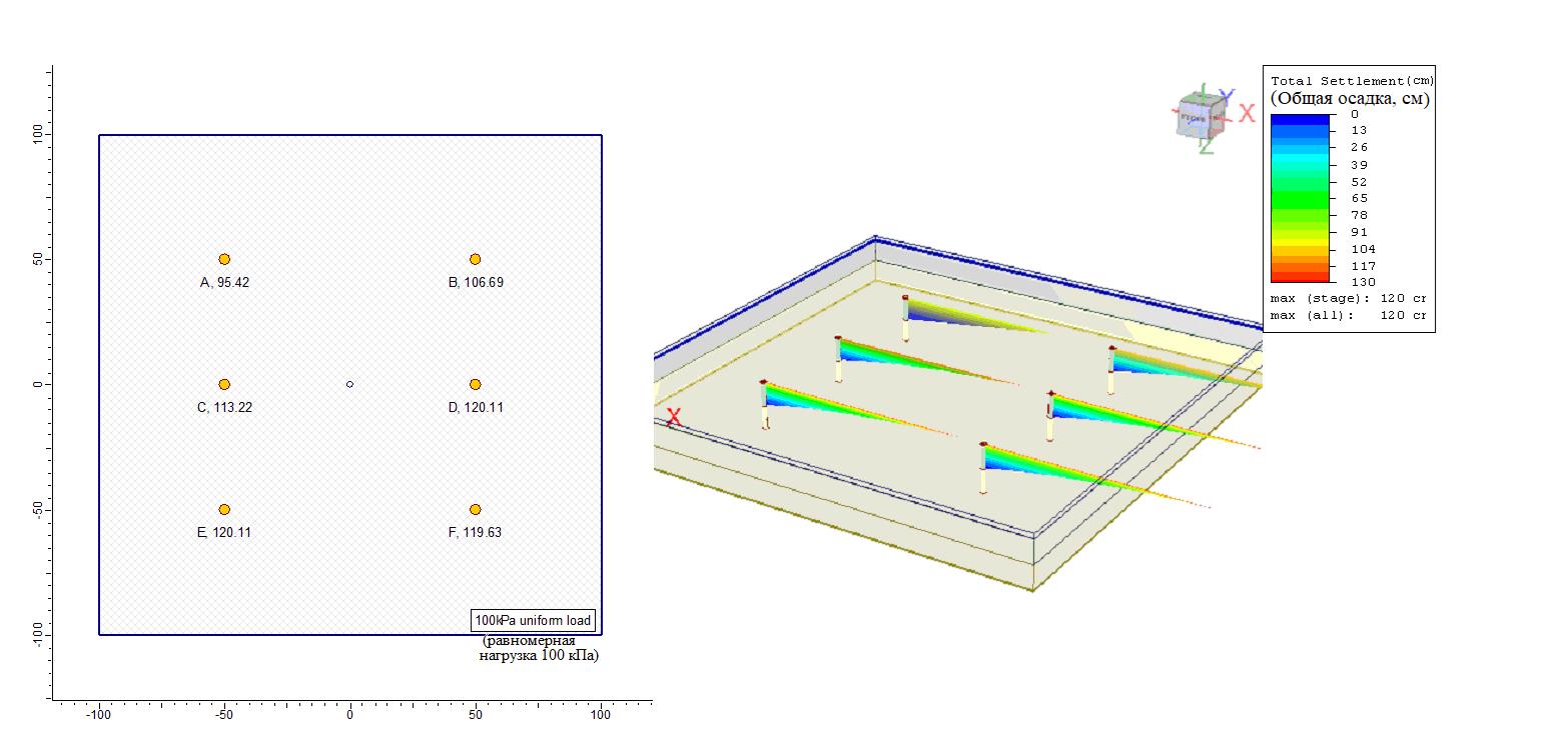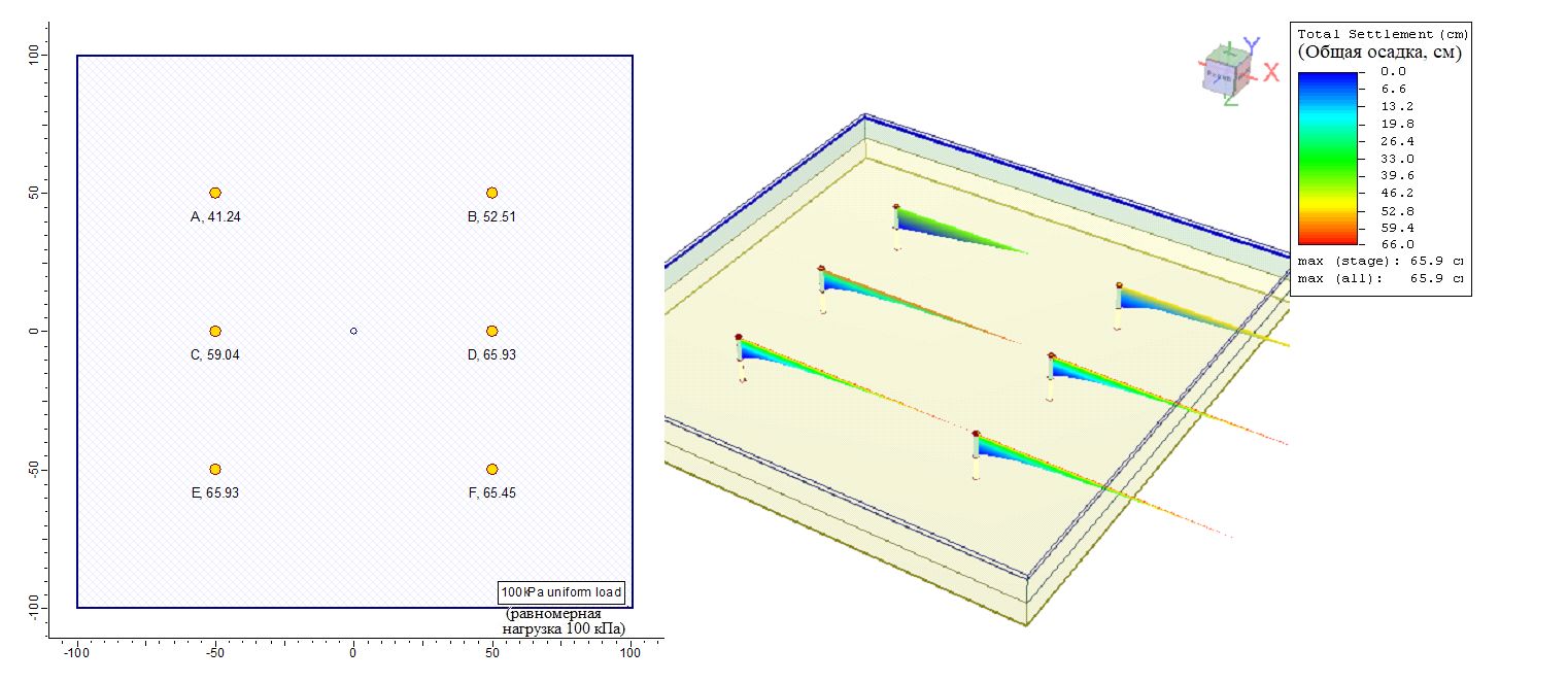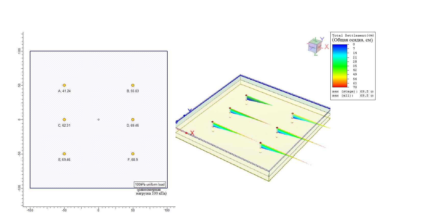 На рисунке 5 показаны итоги расчетов на основе модели 1 для нормально уплотненной глины: план и трехмерные изображения с вычисленными осадками. Понятно, что результаты оценки осадок для разных точек запроса получаются разными, за исключением точек D и E, для каждой из которых количество подразделений должно быть равно 100. Слой глины, показанный зеленым цветом, имеет толщину 10 м, залегает у поверхности земли и непосредственно под поверхностной нагрузкой. Расчеты осадки в диалоговом окне Soil Properties («Свойства грунта») ограничиваются первичной компрессией (см. учебные материалы по пользованию программой Settle3 на сайте rocscience.com).