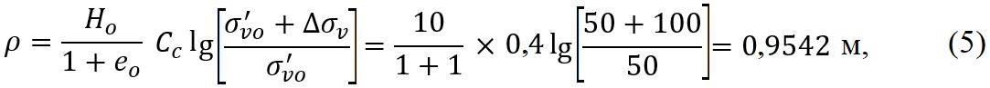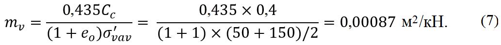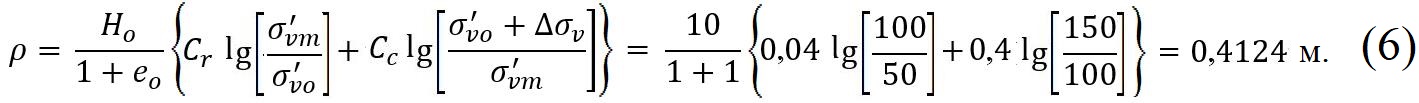 Ручной расчет осадки слоя при среднем для него OCR = 2, то есть среднем σ‘vm = 100 кПа, показывает, что конечное напряжение превышает максимальное напряжение предварительного уплотнения, так как оно составляет 150 кПа. Следовательно:
