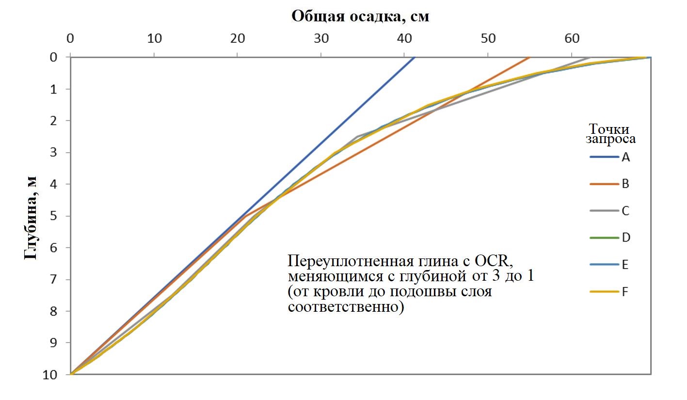 В модели 3 коэффициент переуплотнения изменяется с глубиной от 3 на уровне кровли слоя до 1 на уровне его подошвы. При использовании среднего значения OCR по единому слою осадка должна получиться такой же, как в модели 2, поскольку средний коэффициент переуплотнения в модели 3 равен постоянному OCR в модели 2 (сравните результаты для точки запроса А в моделях 2 и 3, см. рис. 7 и 9). Однако результаты для других точек запроса в этих моделях различаются, и это связано с вычислениями для каждого подслоя на основе его собственного OCR (изменяющегося с глубиной залегания подслоя). Полученные для модели 3 результаты представлены на рисунках 9 и 10.