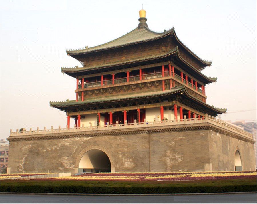 Колокольная башня, символ Сианя (рис. 1), была построена во времена династии Мин (в 1384 году. – Ред.) и представляла собой классическую китайскую постройку из кирпича и дерева. (Сначала ее возвели, чтобы изгнать мифического подземного змея, который якобы вызывал частые землетрясения в Сиане, но потом землетрясения надолго прекратились и здание стало выполнять новую функцию. В башне повесили большой колокол, который каждое утро возвещал о начале трудового дня, откуда в итоге и пошло ее название. В 1582 году ее разобрали и вновь собрали на заново построенном фундаменте в новом центре выросшего города, а в 1739 году реконструировали. Башня имеет высоту 36 м и опирается на квадратный цоколь из зеленого кирпича площадью 1377 м2 и высотой 8,6 м. Выше она имеет три деревянных яруса с темно-зелеными черепичными крышами, углы которых приподняты кверху. Интересно, что при ее строительстве использовались не гвозди, а только пазы и выступы на самих конструкциях. Внутри здание имеет спиралевидную лестницу и украшено традиционными узорами эпох Цин и Мин. Сегодня в Колокольной башне находится музей восковых фигур императоров династий Цинь, Хань и Тан и музей музыкальных инструментов, а также представлена антикварная мебель Цинской эпохи. Вечером она ярко подсвечивается снаружи (ru.wikipedia.org/wiki/Колокольная_башня; advantour.com/rus/china/xian/bell-tower.htm). – Ред.)