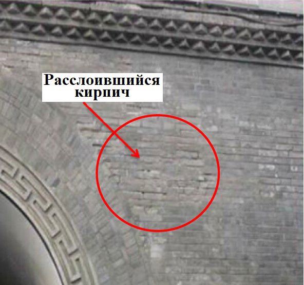 Рис. 3. Один из расслоившихся кирпичей, обнаруженных в цоколе Колокольной башни