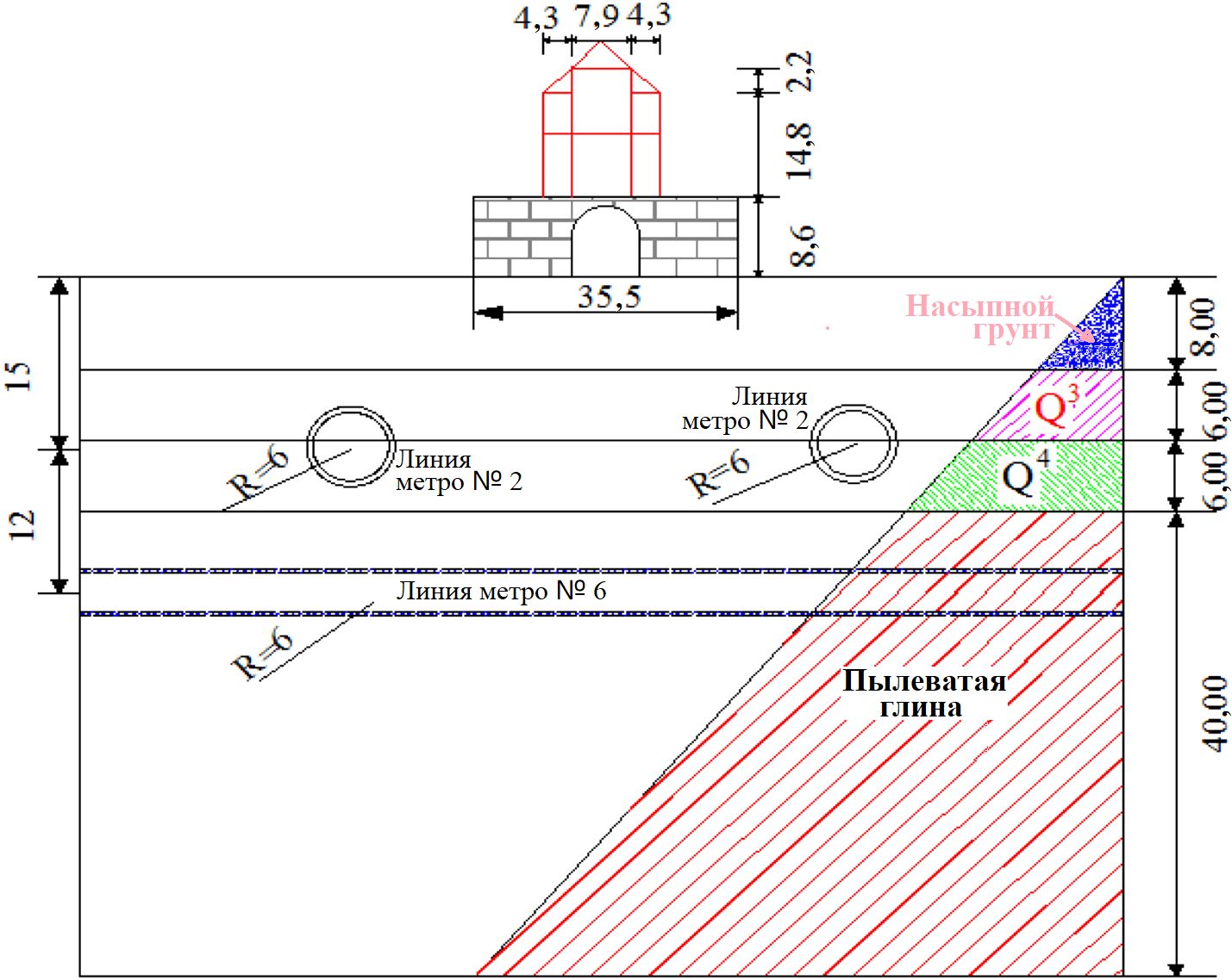 Рис. 4. Схематичный вертикальный разрез Колокольной башни и ее основания. Двойными окружностями показаны тоннели метро. Размеры указаны в метрах